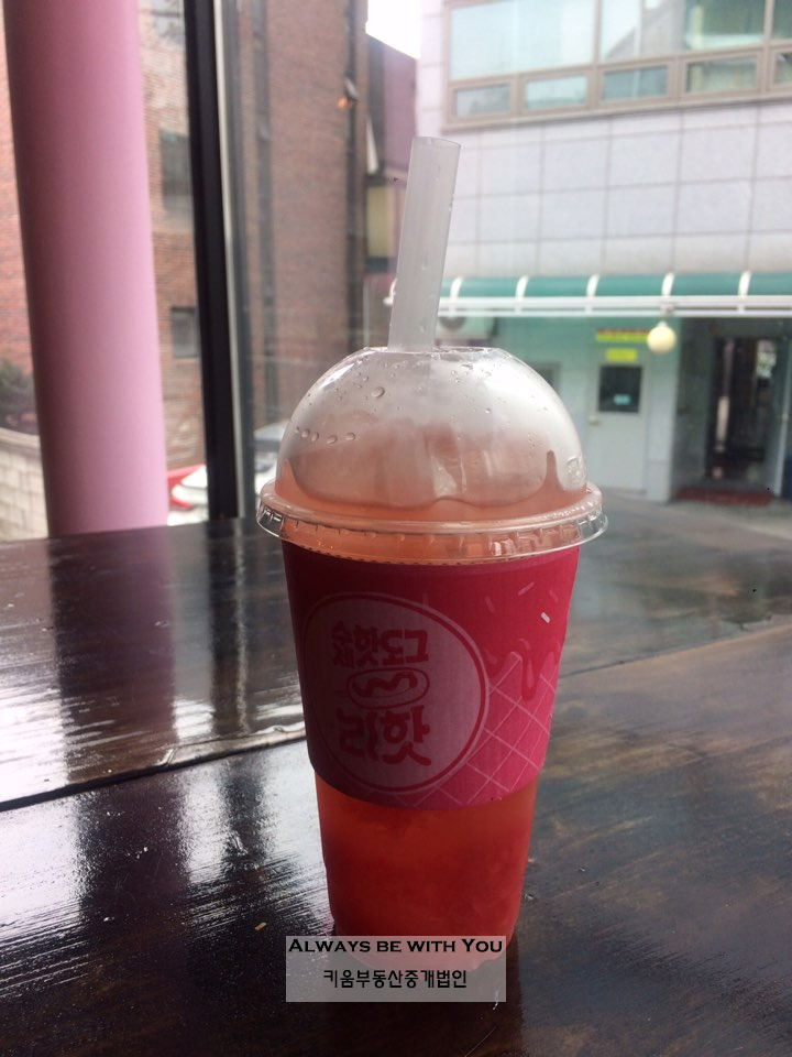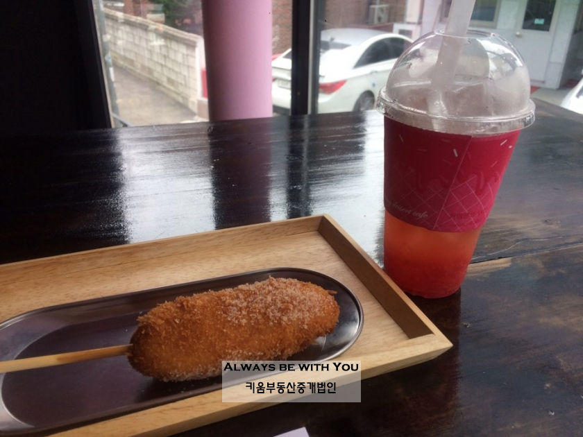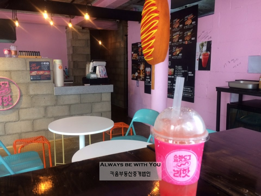 "1800원의 저렴한 불고기맛 수제핫도그. 핫도그와 함께 마실 수 있는 에이드는 천연 과즙 그대로의 맛과 청량감이 최고."