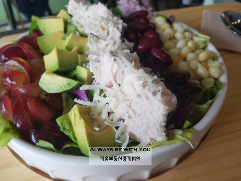 "아보카도 전문 샐러드카페. 큰 아보카도 반 개를 넣어주는 만큼 양도 푸짐하고 강남콩, 옥수수, 야채, 청포도 등의 단백질과 비타민 풍부한 채소와 과일이 들어있어 영양만점의 샐러드입니다."